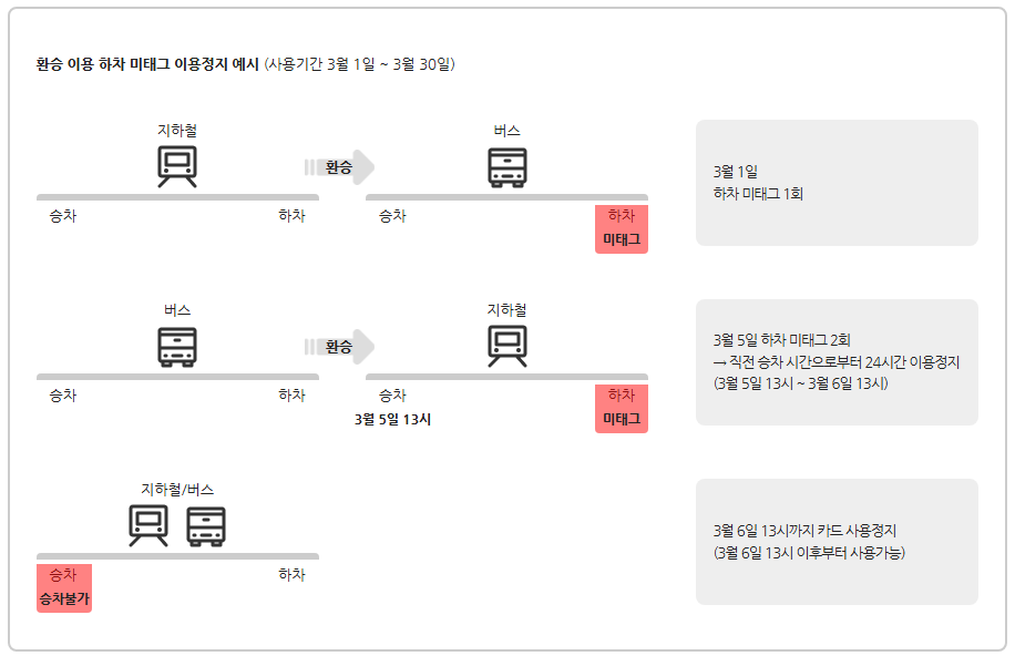 - 지하철/버스 탑승 시: 승·하차 모두 태그 필수