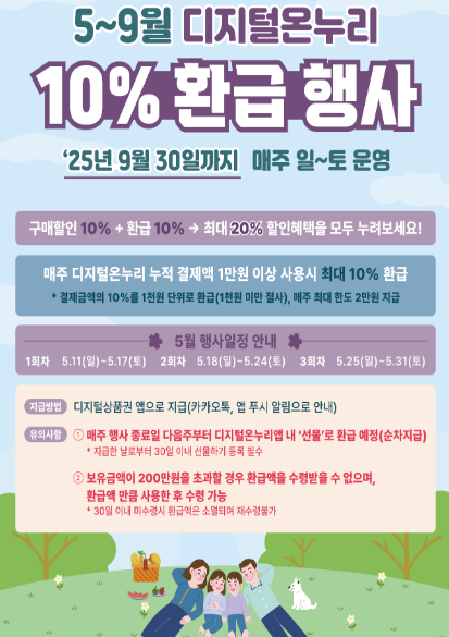 디지털 온누리 상품권 이벤트의 핵심은 바로 주간 10% 환급 제도입니다. 2025년 5월 11일(일)부터 9월 30일(화)까지, 상품권 사용 금액의 10%를 매주 환급받을 수 있어요. 단, 주간 최소 1만 원 이상 사용 시, 최대 회차 당 2만 원까지 환급됩니다.