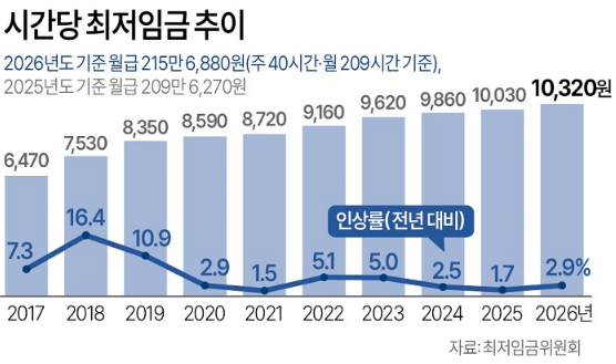 2026년부터 적용될 최저시급은 10,320원입니다. 이는 2025년 기준 시급 10,030원에서 290원 인상, 인상률은 2.9%입니다.