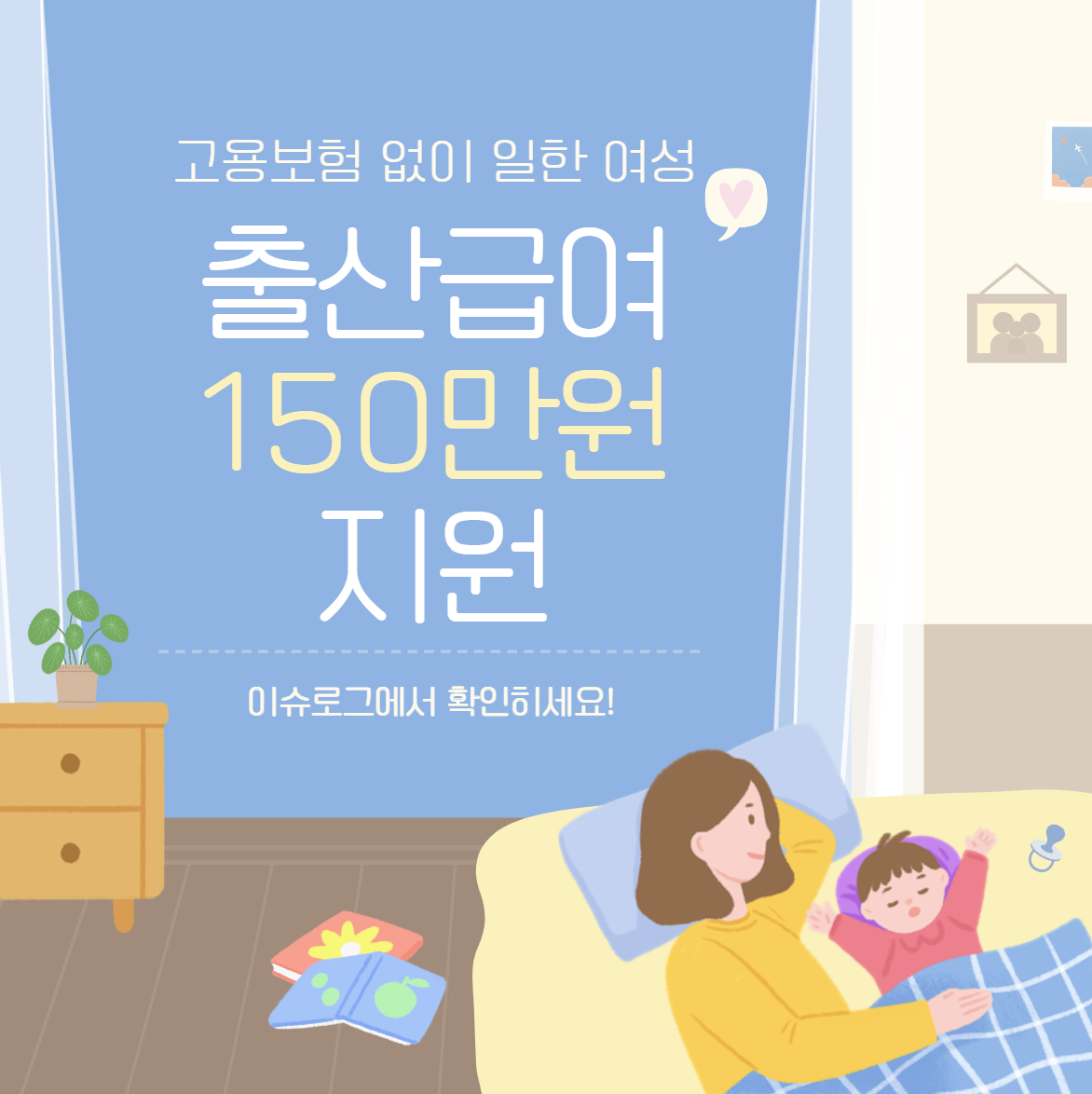 출산 후 소득단절의 위기를 겪는 분들이 이 제도를 통해 실질적인 경제적 지원과 심리적 안정을 동시에 얻을 수 있도록 마련된 만큼, 본인의 상황과 조건을 점검하고 꼭 신청해보시기 바랍니다.