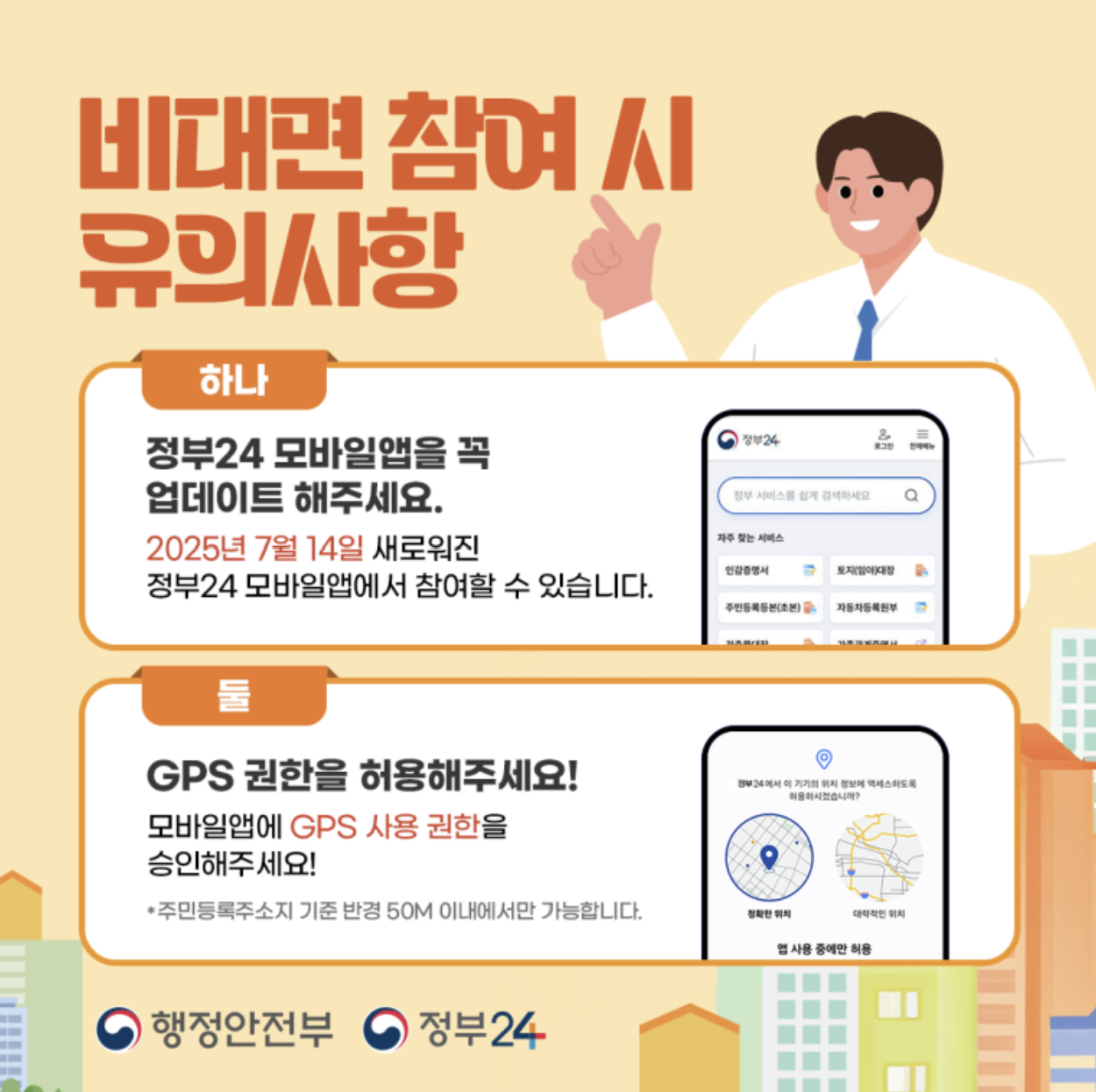 ‘정부24’ 앱에 접속한 후, 본인 인증을 통해 실제 거주 정보를 입력하고 제출하면 완료됩니다. 집에서도 쉽게 참여할 수 있어 많은 국민들이 이 비대면 방식을 선호하고 있죠.