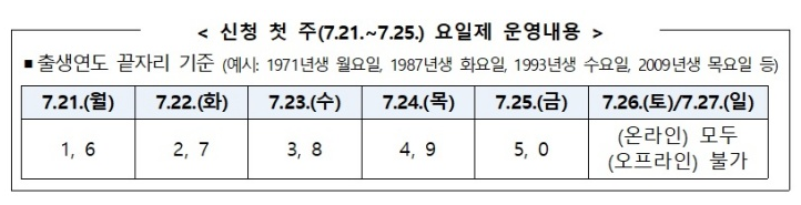 ‘민생회복 소비쿠폰’은 신청자의 출생연도 끝자리 요일제에 따라 첫 주는 요일별, 이후는 누구나 신청할 수 있습니다.