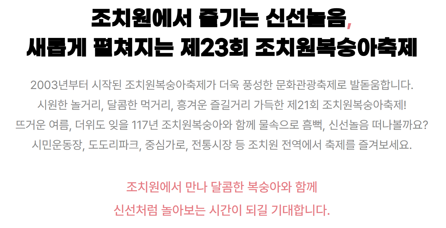 ‘세종 조치원 복숭아 축제’를 꼭 가봐야 하는 이유, 어떤 프로그램이 있는지, 어떻게 가면 좋은지까지 이 글에서 알차게 소개해드릴게요. 올해 마지막 기회를 잡으시고, 혹시 올해는 놓쳤더라도 내년엔 꼭 이 축제를 관심있게 보실 수 있도록 미리 알아두시길 추천합니다.