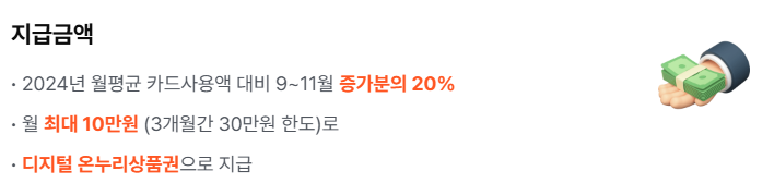 2025년 9월 15일부터 11월 30일까지 약 석 달 동안 진행되며, 이 기간 동안 신용/체크카드 소비가 지난해 자신의 월평균 카드 사용액보다 많을 경우, 증가분의 20%를 디지털 온누리상품권으로 환급해줍니다.