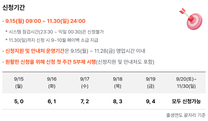 상생페이백 신청은 2025년 9월 15일 오전 9시부터 11월 30일 밤 12시까지 진행됩니다. 특히 첫 주(9월 15일~19일)에는 신청자가 몰릴 것을 고려해, 출생연도 끝자리별로 나눠 5부제 방식으로 접수가 시작됩니다.