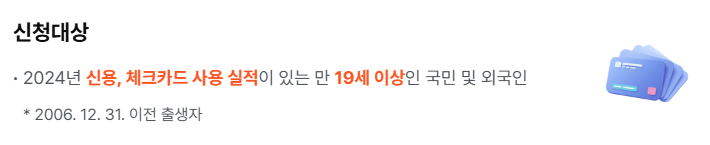 신청 대상은 만 19세 이상(2006년 12월 31일 이전 출생) 국내 거주자와 외국인(외국인등록증 소지자) 모두 포함됩니다. 다만 지난 해(2024년) 신용카드 혹은 체크카드 실적이 반드시 있어야 하며, 가족 대리 신청이나 공동 명의 카드는 인정되지 않으니 반드시 본인이 직접 신청해야 합니다. 외국인 역시 등록증과 지난해 카드 실적만 있으면 동일하게 참여할 수 있습니다.