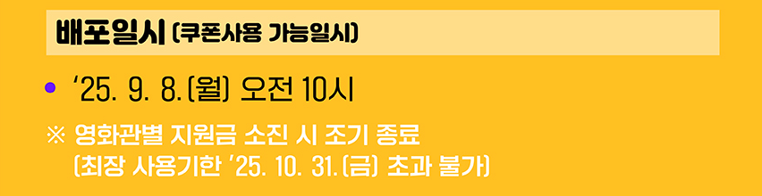 이번 2차 배포는 9월 8일 월요일 오전 10시부터 시작됩니다. 지난 7월 25일에 시작된 1차 배포에서 450만 장이 풀렸는데, 사용되지 않은 잔여분 188만 장이 남아 있거든요. 정부는 많은 국민이 조금 더 쉽게 영화를 즐길 수 있도록 남은 쿠폰을 다시 풀기로 했습니다.