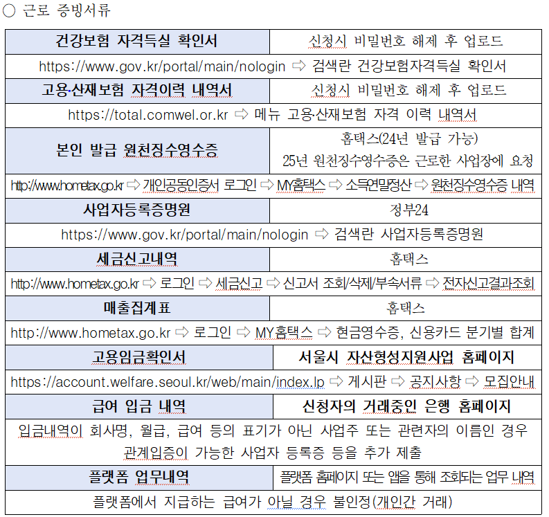 신청자가 근로 중임을 증빙해야 하며, ①번 또는 ②번 중 하나를 선택하여 제출할 수 있습니다.