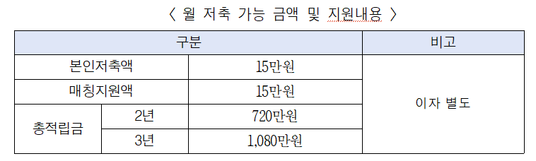 저축 금액(10만 원 또는 15만 원)과 기간(2년 또는 3년)은 본인이 선택할 수 있습니다.