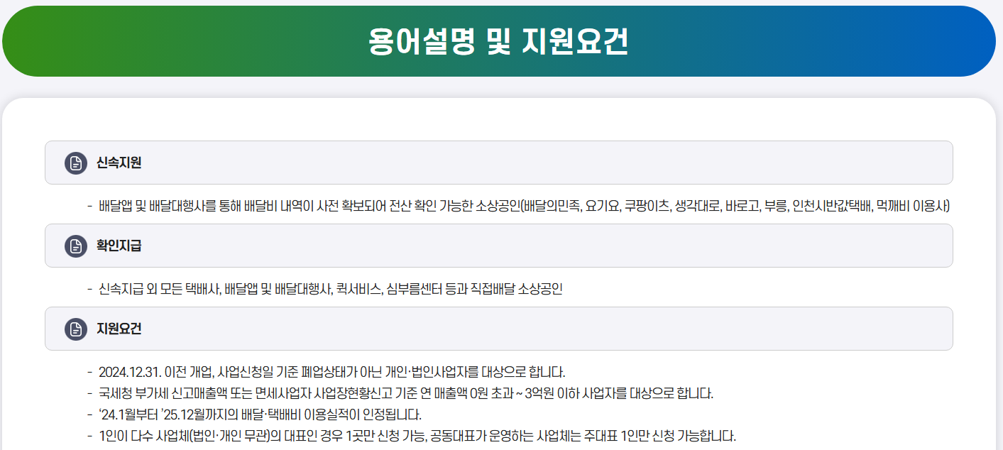 배달 또는 택배 실적은 2024년 1월 1일부터 2025년 신청일까지의 자료만 인정되며, 실적이 증명되어야만 신청이 가능합니다.