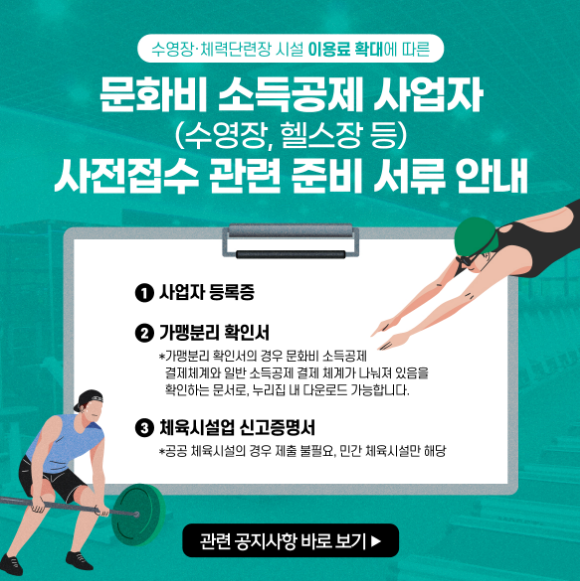 해당 제도에 대한 공고는 대한민국 정책브리핑, 문화비 소득공제 누리집, 국세청 홈택스 등에서 확인할 수 있으며, 체육시설 사업자와 근로소득자 모두에게 자세한 가이드가 제공됩니다.