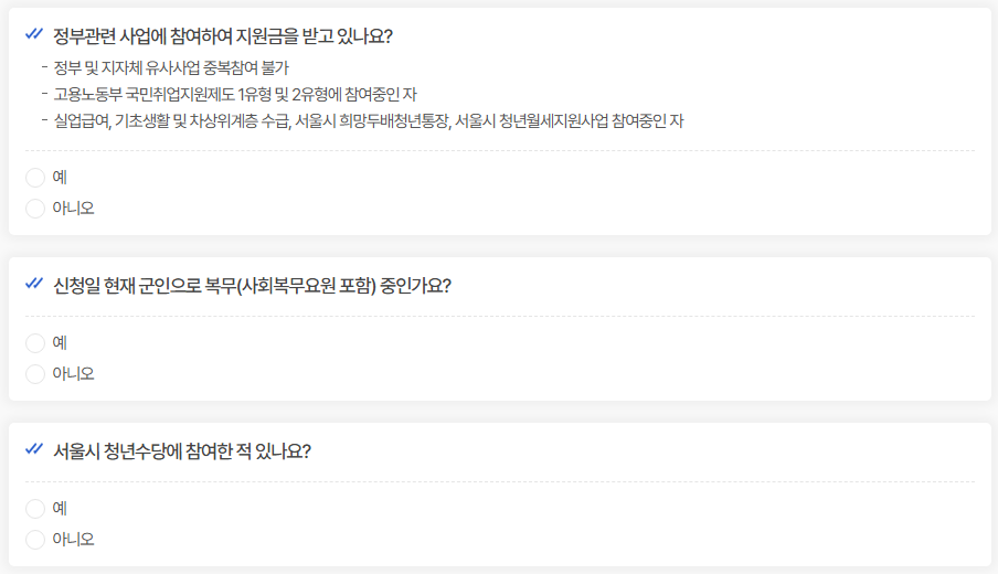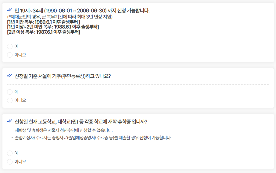 - 대상: 서울에 주민등록이 된 만 19~34세(단, 의무복무 제대 청년은 복무기간만큼 연장되어 최대 만 37세까지)