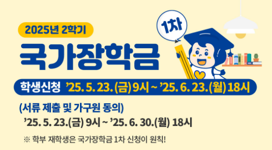 2025학년도 2학기 국가장학금 1차 신청이 5월 23일(금) 오전 9시부터 6월 23일(월) 오후 6시까지 열렸습니다.