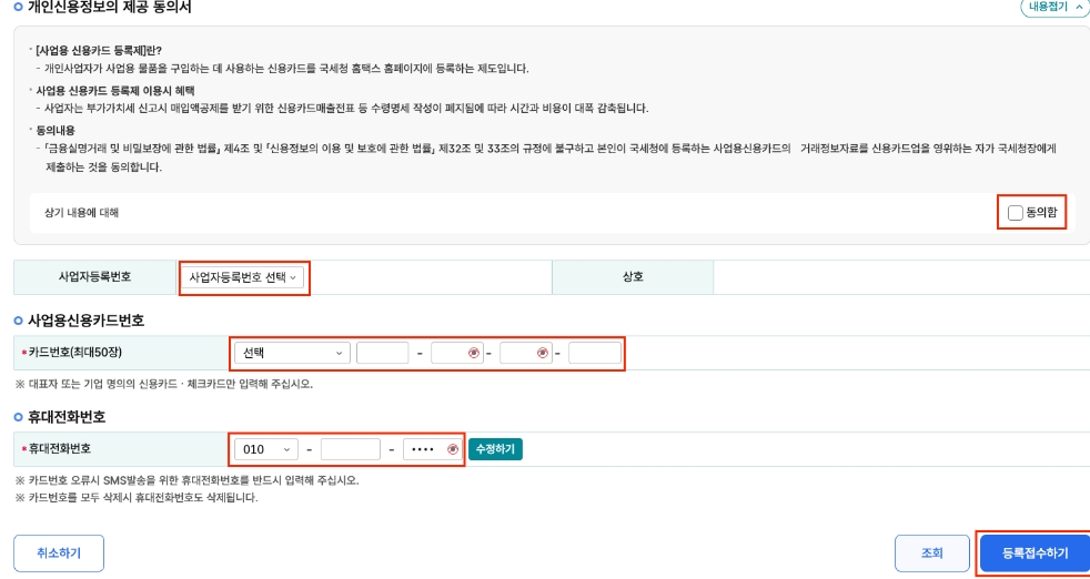 - 개인정보 제공 동의 → 카드번호 + 전화번호 입력 → 등록