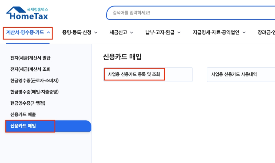 - 메뉴: 조회/발급 → 현금영수증·신용카드 → 사업용 신용카드 → 등록 및 조회 클릭